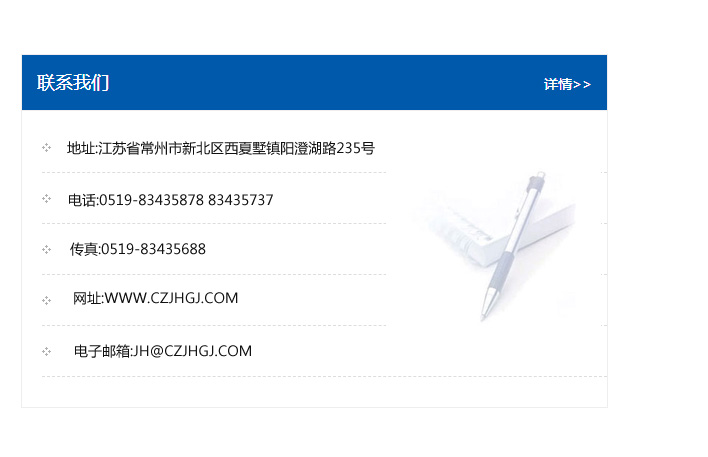 地址:常州市新北區友邦商務大廈1幢16、17層  電話:0519-85101652  傳真:0519-85112595  郵編:213022  網址:www.cz-jiayue_cn.1217game.com  郵箱:xiajifengaa@163.com